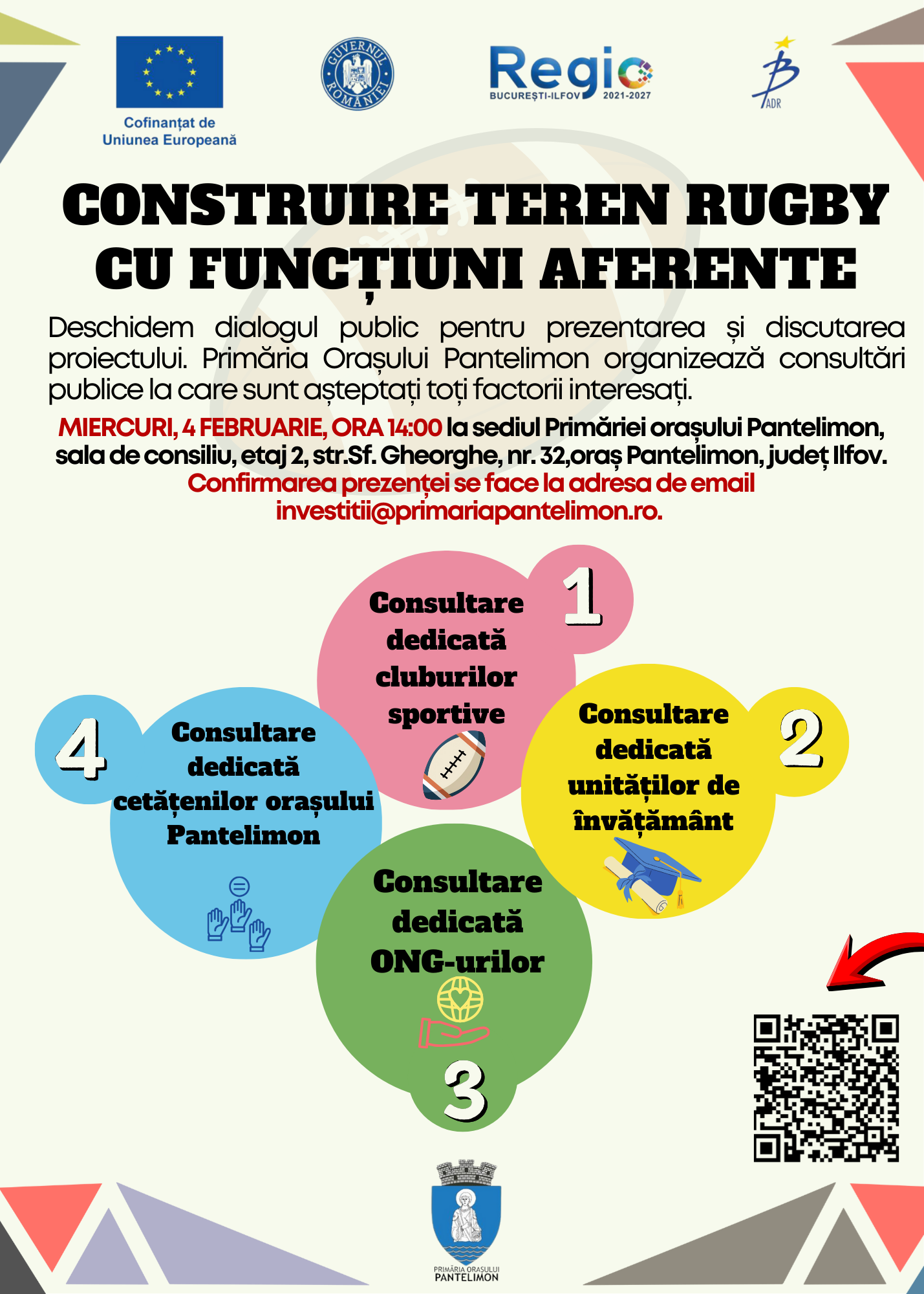 Confirmarea prezenței se face la adresa de e-mail: investitii@primariapantelimon.ro.